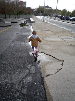 the second technique is the more traditional "puddle stomp" whereby one little rubber-clad foot is introduced, impatient style, to a small body of water. tap, tap, tap. big on attitude, little on splash.
